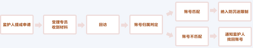 在监护人发现被监护人有沉溺厦门盟易娱乐平台的情况下,监护人可向游家公司申请发起未成年人家长监护机制。 监护人需亲自通过邮寄方式 向我司提供有效材料,向游家公司提出未成年人账户监控的申请。在收到邮件后,我司即开始启动监护机制审核流程,首先进入疑似账号身份确认期。